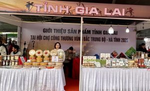 Không chỉ có sản phẩm của Hà Tĩnh, hội chợ năm nay quy tụ rất nhiều doanh nghiệp đến từ các tỉnh trong khu vực như Nghệ An, Quảng Trị, Thừa Thiên – Huế… và nhiều địa phương khác. Mỗi gian hàng mang một nét văn hóa, một câu chuyện sản xuất và một hương vị riêng, tạo nên bức tranh sinh động về sự phong phú của sản phẩm vùng miền Việt Nam. Đặc biệt, gian hàng của tỉnh Gia Lai là điểm nhấn thu hút sự quan tâm lớn của khách tham quan. Không gian trưng bày mang đậm dấu ấn Tây Nguyên với sắc nâu đỏ đặc trưng, giới thiệu hàng loạt sản phẩm tiêu biểu như cà phê Arabica, Robusta, tiêu sạch, mật ong rừng, dược liệu và các sản phẩm thủ công mỹ nghệ. Đại diện doanh nghiệp Gia Lai cho biết: “Chúng tôi xem hội chợ này là cầu nối rất quan trọng để mang sản phẩm Tây Nguyên đến gần hơn với khách hàng Bắc Trung Bộ. Nhiều khách sau khi thử cà phê đã quan tâm đặt hàng số lượng lớn hoặc muốn hợp tác phân phối.” Gian hàng Gia Lai không chỉ góp phần làm phong phú hội chợ mà còn mở ra cơ hội giao thương liên vùng cho các doanh nghiệp Tây Nguyên.