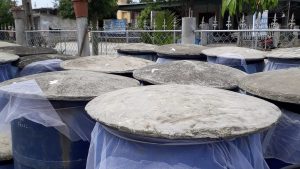Hệ thống thùng ủ sứa ép tại cơ sở chế biến Mai Dung được che đậy, bảo quản đúng quy trình nhằm đảm bảo chất lượng và an toàn thực phẩm.