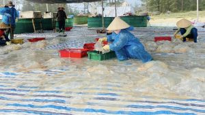 Lao động địa phương tham gia sơ chế sứa tại cơ sở sứa ép Mai Dung, tạo việc làm ổn định trong mùa khai thác sứa.