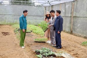 Đại diện chính quyền địa phương kiểm tra diện tích dưa chuột đang thời kỳ phát triển, trao đổi kỹ thuật với chủ mô hình