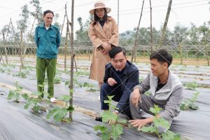Đại diện chính quyền địa phương kiểm tra diện tích dưa chuột đang thời kỳ phát triển, trao đổi kỹ thuật với chủ mô hình